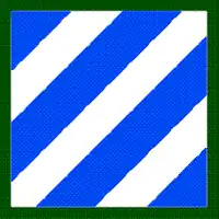 - Upon a blue square 2 inches (5.08 cm), three white stripes each 3/8 inch (.95 cm) in width from heraldic sinister chief to dexter base; the blue background between the white stripes also being 3/8 inch (.95 cm) in width; all within a 1/8 inch (.32 cm) Army Green border.