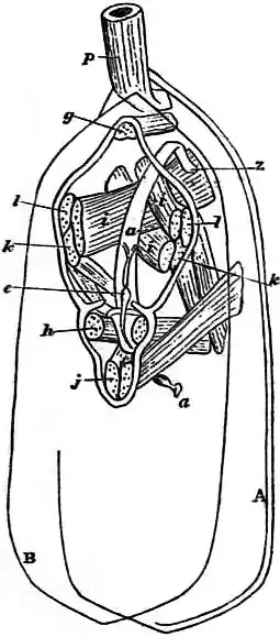 Circulatory System.—The structures formerly regarded as pseudohearts have been shown by Huxley to be nephridia; the true heart was described and figured by A. Hancock, but has in many cases escaped the observation of later zoologists. F. Blochmann in 1884, however, observed this organ in the living animal in species of the following genera:—Terebratulina, Magellania [Waldheimia], Rhynchonella, Megathyris (Argiope), Lingula, and Crania (fig. 21). It consists of a definite contractile sac or sacs lying on the dorsal side of the alimentary canal near the oesophagus, and in preparations of Terebratulina made by quickly removing the viscera and examining them in sea-water under a microscope, he was able to count the pulsations, which followed one another at intervals of 30–40 seconds.