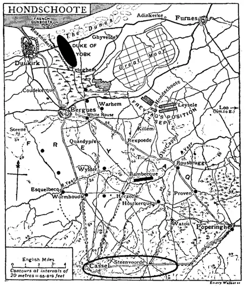 Thither came Carnot, the engineer officer who was in charge of military affairs In the Committee of Public Safety and is known to history as the “Organizer of Victory.” His views of the strategy to be pursued indicate either a purely geographical idea of war, which does not square with his later principles and practice, or, as is far more likely, a profound disbelief in the capacity of the Army of the North, as it then stood, to fight a battle, and they went no further than to recommend an inroad into Flanders on the ground that no enemy would be encountered there. This, however, in the event developed into an operation of almost decisive importance, for at the moment of its inception the duke of York was already on the march. Fighting en route a very severe but successful action (Lincelles, Aug. 18) with the French troops encamped near Lille, the Anglo-Hanoverians entered the district—densely intersected with canals and morasses—around Dunkirk and Bergues on the 21st and 22nd. On the right, by way of Furnes, the British moved towards Dunkirk and invested the east front of the weak fortress, while on the left the Hanoverian field marshal v. Freytag moved via Poperinghe on Bergues. The French had a chain of outposts between Furnes and Bergues, but Freytag attacked them resolutely, and the defenders, except a brave handful who stood to cross bayonets, fled in all directions. The east front of Bergues was invested on the 23rd, and Freytag spread out his Dunkirk.forces to cover the duke of York’s attack on Dunkirk, his right being opposite Bergues and his centre at Bambeke, while his left covered the space between Roosbrugge and Ypres with a cordon of posts. Houchard was in despair at the bad conduct of his troops. But one young general, Jourdan, anticipating Houchard’s orders, had already brought a strong force from Lille to Cassel, whence he incessantly harried Freytag’s posts. Carnot encouraged the garrisons of Dunkirk and Bergues, and caused the sluices to be opened. The moral of the defenders rose rapidly. Houchard prepared to bring up every available man of the Army of the North, and only waited to make up his mind as to the direction in which his attack should be made. The Allies themselves recognized the extreme danger of their position. It was cut in half by the Great Morass, stretches of which extended even to Furnes. Neither Dunkirk nor Bergues could be completely invested owing to the inundations, and Freytag sent a message to King George III. to the effect that if Dunkirk did not surrender in a few days the expedition would be a complete failure.
