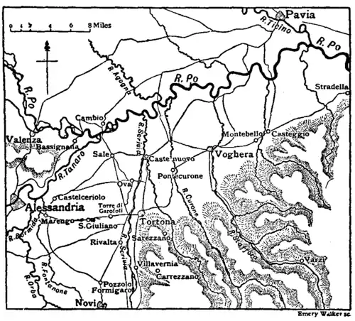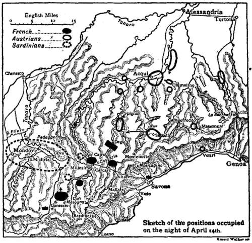- ↑ On the strength of a report, false as it turned out, that the Austrian rearguard had broken the bridges of the Bormida.
