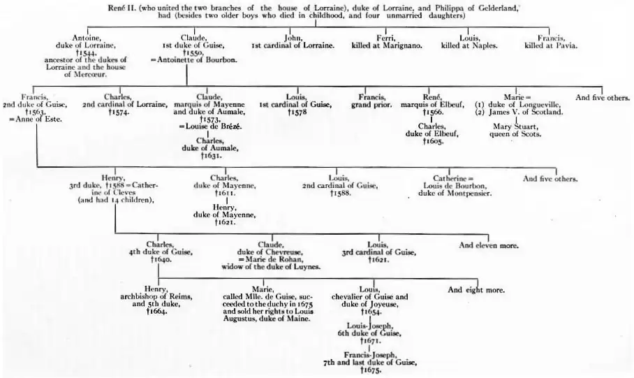 GUISE, HOUSE OF, a cadet branch of the house of Lorraine (q.v.). René II., duke of Lorraine (d. 1508), united the two branches of the house of Lorraine. From his paternal grandmother, Marie d’Harcourt, René inherited the countships of Aumale, Mayenne, Elbeuf, Lillebonne, Brionne and other French fiefs, in addition to the honours of the elder branch, which included the countship of Guise, the dowry of Marie of Blois on her marriage in 1333 with Rudolph or Raoul of Lorraine. René’s eldest surviving son by his marriage with Philippa, daughter of Adolphus of Egmont, duke of Gelderland, was Anthony, who succeeded his father as duke of Lorraine (d. 1544), while the second, Claude, count and afterwards duke of Guise, received the French fiefs. The Guises, though naturalized in France, continued to interest themselves in the fortunes of Lorraine, and their enemies were always ready to designate them as foreigners. The partition between the brothers Anthony and Claude was ratified by a further agreement in 1530, reserving the lapsed honours of the kingdoms of Jerusalem, Sicily, Aragon, the duchy of Anjou and the countships of Provence and Maine to the duke of Lorraine. Of the other sons of René II., John (1498–1550) became the first cardinal of Lorraine, while Ferri, Louis and Francis fell fighting in the French armies at Marignano (1515), Naples (1528) and Pavia (1525) respectively.