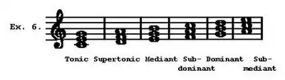 a. Direct Relationships.—The first principle on which two keys are considered to be related is a strengthening of that which determined the so-called modulations of the 16th-century modes. Two keys are directly related when the tonic chord of the one is among the common chords of the other. Thus, D minor is related to C major because the tonic chord of D minor is the common chord on the supertonic of C (see Ex. 6). In the same way the four other related keys to C major are E minor the mediant, F major the subdominant, G major the dominant and A minor the submediant.