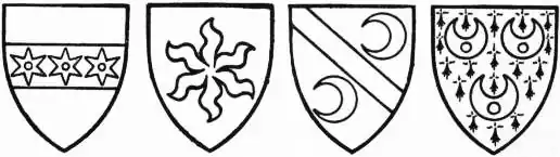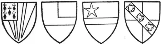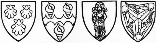 A scythe was in the shield of Praers; Picot had picks; Bilsby a hammer or “beal”; Malet showed mallets. The chamberlain’s key is in the shield of a Chamberlain, and the spenser’s key in that of a Spenser. Porter bore the porter’s bell, Boteler the butler’s cup. Three-legged pots were borne by Monbocher. Crowns are for Coroun. Yarde had yard-wands; Bordoun a burdon or pilgrim’s staff.
