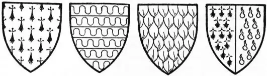 While bearing in mind that the two words have no distinctive force in ancient armory, the student and the herald of modern times may conveniently allow himself to blazon the sharp and saw-toothed line as “indented” and the scolloped line as “engrailed,” especially when dealing with the debased armory in which the distinction is held to be a true one and one of the first importance. One error at least he must avoid, and that is the following of the heraldry-book compilers in their use of the word “dancetty.” A “dancetty” line, we are told, is a line having fewer and deeper indentures than the line indented. But no dancetty line could make a bolder dash across the shield than do the lines which the old armorists recognized as “indented.” In old armory we have fesses dancy—commonly called “dances”—bends dancy, or cheverons dancy; there are no chiefs dancy nor borders dancy, nor are there shields blazoned as parted with a dancy line. Waved lines, battled lines and ragged lines need little explanation that a picture cannot give. The word invecked or invected is sometimes applied by old-fashioned heraldic pedants to engrailed lines; later pedants have given it to a line found in modern grants of arms, an engrailed line reversed. Dove-tailed and urdy lines are mere modernisms. Of the very rare nebuly or clouded line we can only say that the ancient form, which imitated the conventional cloud-bank of the old painters, is now almost forgotten, while the bold “wavy” lines of early armory have the word “nebuly” misapplied to them.