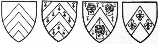 The chief is the upper part of the shield and, marked out by a line of division, it is taken as one of the Ordinaries. Shields with a plain chief and no more are rare in England, but Tichborne of Tichborne has borne since the 13th century “Vair a chief gold.” According to the heraldry books the chief should be marked off as a third part of the shield, but its depth varies, being broader when charged with devices and narrower when, itself uncharged, it surmounts a charged field. Fenwick bore “Silver a chief gules with six martlets countercoloured,” and in this case the chief would be the half of the shield. Clinging to the belief that the chief must not fill more than a third of the shield, the heraldry books abandon the word in such cases, blazoning them as “party per fesse.”