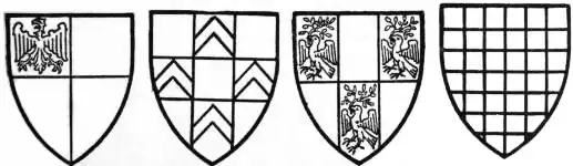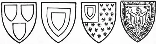 The last detail to be noted in medieval marshalling is the introduction into the shield of another surmounting shield called by old armorists the “innerscocheon” and by modern blazoners the “inescutcheon.” John the Fearless, count of Flanders, marshalled his arms in 1409 as a quartered shield of the new and old coats of Burgundy. Above these coats a little scocheon, borne over the crossing of the quartering lines, had the black lion of Flanders, the arms of his mother. Richard Beauchamp, the adventurous earl of Warwick, who had seen most European courts during his wanderings, may have had this shield in mind when, over his arms of Beauchamp quartering Newburgh, he set a scocheon of Clare quartering Despenser, the arms of his wife Isabel Despenser, co-heir of the earls of Gloucester. The seal of his son-in-law, the King-Maker, shows four quarters—Beauchamp quartering Clare, Montagu quartering Monthermer, Nevill alone, and Newburgh quartering Despenser. An interesting use of the scocheon en surtout is that made by Richard Wydvile, Lord Rivers, whose garter stall-plate has a grand quarter of Wydvile and Prouz quartering Beauchamp of Hache, the whole surmounted by a scocheon with the arms of Reviers or Rivers, the house from which he took the title of his barony. On the continent the common use of the scocheon is to bear the paternal arms of a sovereign or noble, surmounting the quarterings of his kingdoms, principalities, fiefs or seigniories. Our own prince of Wales bears the arms of Saxony above those of the United Kingdom differenced with his silver label. Marshalling takes its most elaborate form, the most removed from the graceful simplicity of the middle ages, in such shields as the “Great Arms” of the Austrian empire, wherein are nine grand quarters each marshalling in various fashions from three to eleven coats, six of the grand-quarters bearing scocheons en surtout, each scocheon ensigned with a different crown.