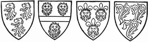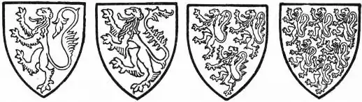 Of all men, kings and princes might be the first to be found bearing arms. Yet the first English sovereign who appears on his great seal with arms on his shield is Richard I. His seal of 1189 shows his shield charged with a lion ramping towards the sinister side. Since one half only is seen of the rounded face of the shield, English antiquaries have perhaps too hastily suggested that the whole bearing was two lions face to face. But the mounted figure of Philip of Alsace, count of Flanders, on his seal of 1164 bears a like shield charged with a like lion, and in this case another shield on the counterseal makes it clear that this is the single lion of Flanders. Therefore we may take it that, in 1189, King Richard bore arms of a lion rampant, while, nine years later, another seal shows him with a shield of the familiar bearings which have been borne as the arms of England by each one of his successors.