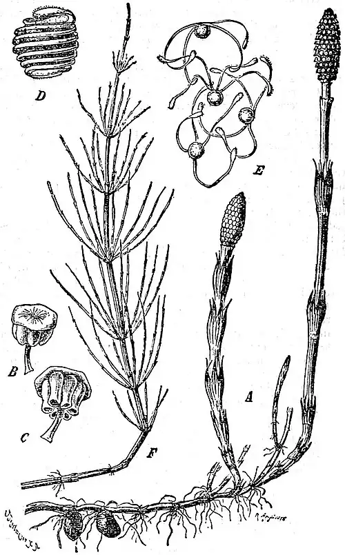They are herbaceous plants growing from an underground much-branched rootstock from which spring slender aerial shoots which are green, ribbed, and bear at each node a whorl of leaves reduced to a toothed sheath. From the nodes spring whorls of similar but more slender branches. Some shoots are sterile while others are fertile, bearing at the apex the so-called fructification—a dense oval, oblong conical or cylindrical spike, consisting of a number of shortly-stalked peltate scales, each of which has attached to its under surface a circle of spore-cases (sporangia) which open by a longitudinal slit on their inner side. The spores differ from those of ferns in their outer coat (exospore) being split up into four club-shaped hygroscopic threads (elaters) which are curled when moist, but become straightened when dry. In most species the fertile and sterile shoots are alike, both being green and leaf-bearing, but in a few species the fertile are more or less different, e.g. in E. arvense the fertile shoots appear first, in the spring, and are unbranched and not green. Any portion of the underground rhizome when broken off is capable of producing a new plant; hence the difficulty of eradicating them when once established. There are 24 known species of the genus which is universally distributed.