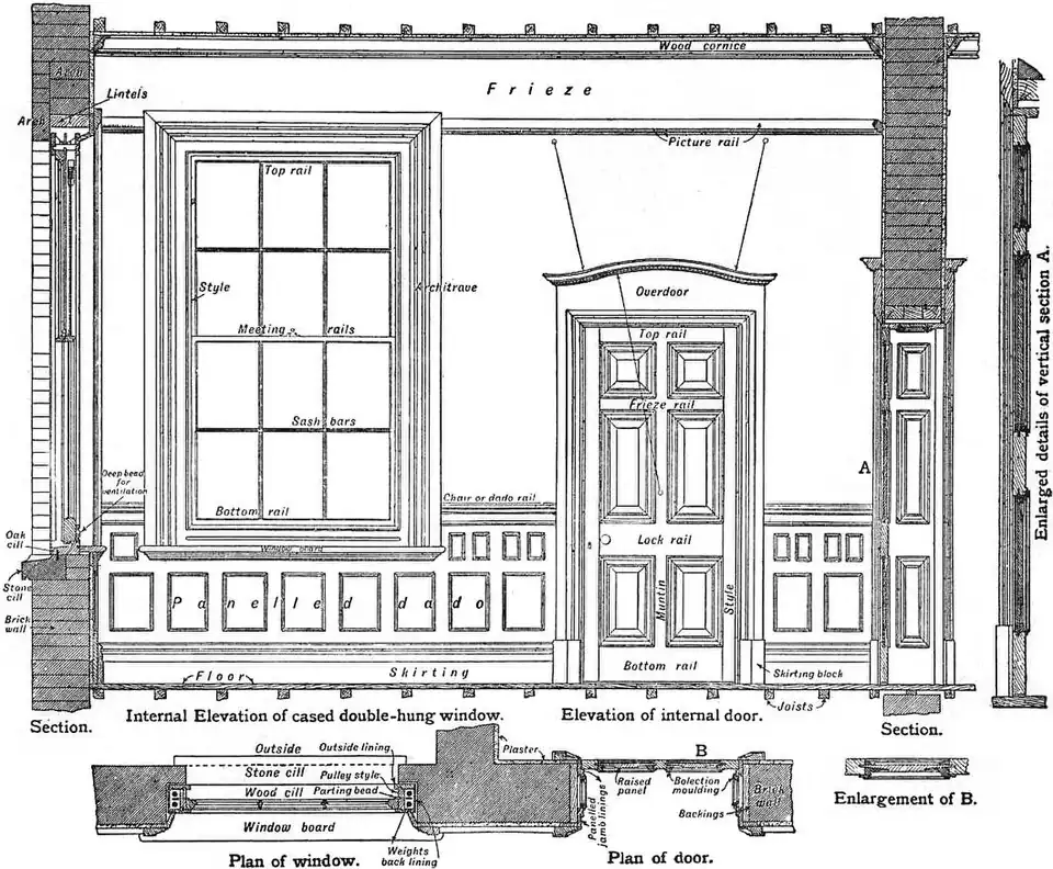 Doors.—External doors are usually hung to solid frames placed in the reveals of the brick or stone wall. The frames are rebated for the door and ornamented by mouldings either stuck or planted on. The jambs or posts are tenoned, wedged and glued to the head, and the feet secured to the sill by stub tenons or dowels of iron. Solid window frames are of similar construction and are used chiefly for casements and sashes hung on centres as already described. Internal doors are hung to jamb linings (fig. 7). They are usually about 11/2 in. thick and rebated for the door. When the width of jamb allows it, panelling may be introduced as in the example shown. The linings are nailed or screwed to rough framed grounds 1 in. in thickness plugged or nailed to the wall or partition. Architraves are the borders or finishing mouldings fixed around a window or door opening, and screwed or nailed to wood grounds. They are variously moulded according to the fancy of the designer. The ordinary form of architrave is shown in the illustration of a cased window frame (fig. 8), and a variation appears in the combined architrave and over door frieze and capping fitted around the six-panelled door (fig. 7). The latter would need to be worked and framed in the shop and fixed entire. Polished hard wood architraves may be secretly fixed, i.e. without the heads of nails or screws showing on the face, by putting screws into the grounds with their heads slightly projecting, and hanging the moulding on them by means of keyhole slots formed in the back.