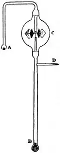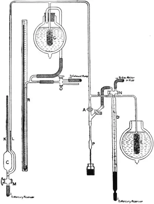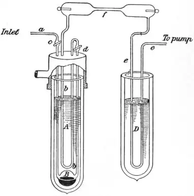 Vacuum Vessels.—The problem involved in the liquefaction of hydrogen was in reality a double one. In the first place, the gas had to be cooled to such a temperature that the change to the liquid state was rendered possible. In the second, means had to be discovered for protecting it, when so cooled, from the influx of external heat, and since the rate at which heat is transferred from one body to another increases very rapidly with the difference between their temperatures, the question of efficient heat insulation became at once more difficult and more urgent in proportion to the degree of cold attained. The second part of the problem was in fact solved first. Of course packing with non-conducting materials was an obvious expedient when it was not necessary that the contents of the apparatus should be visible to the eye, but in the numerous instances when this was not the case such measures were out of the question. Attempts were made to secure the desired end by surrounding the vessel that contained the cooled or liquid gas with a succession of other vessels, through which was conducted the vapour given off from the interior one. Such devices involved awkward complications in the arrangement of the apparatus, and besides were not as a rule very efficient, although some workers, e.g. Dr Kamerlingh Onnes, of Leiden, reported some success with their use. In 1892 it occurred to Dewar that the principle of an arrangement he had used nearly twenty years before for some calorimetric experiments on the physical constants of hydrogenium, which was a natural deduction from the work of Dulong and Petit on radiation, might be employed with advantage as well to protect cold substances from heat as hot ones from cold. He therefore tried the effect of surrounding his liquefied gas with a highly exhausted space. The result was entirely successful. Experiment showed that liquid air contained in a glass vessel with two walls, the space between which was a high vacuum, evaporated at only one fifth the rate it did when in an ordinary vessel surrounded with air at atmospheric pressure, the convective transference of heat by means of the gas particles being enormously reduced owing to the vacuum. But in addition these vessels lent themselves to an arrangement by which radiant heat could still further be cut off, since it was found that when the inner wall was coated with a bright deposit of silver, the influx of heat was diminished to one-sixth of the amount existing without the metallic coating. The total effect, therefore, of the high vacuum and silvering is to reduce the in-going heat to one-thirtieth part. In making such vessels a mercurial vacuum has been found very satisfactory. The vessel in which the vacuum is to be produced is provided with a small subsidiary vessel joined by a narrow tube with the main vessel, and connected with a powerful air-pump. A quantity of mercury having been placed in it, it is heated in an oil- or air-bath to about 200° C., so as to volatilize the mercury, the vapour of which is removed by the pump. After the process has gone on for some time, the pipe leading to the pump is sealed off, the vessel immediately removed from the bath, and the small subsidiary part immersed in some cooling agent such as solid carbonic acid or liquid air, whereby the mercury vapour is condensed in the small vessel and a vacuum of enormous tenuity left in the large one. The final step is to seal off the tube connecting the two. In this way a vacuum may be produced having a vapour pressure of about the hundred-millionth of an atmosphere at 0° C. If, however, some liquid mercury be left in the space in which the vacuum is produced, and the containing part of the vessel be filled with liquid air, the bright mirror of mercury which is deposited on the inside wall of the bulb is still more effective than silver in protecting the chamber from the influx of heat, owing to the high refractive index, which involves great reflecting power, and the bad heat-conducting powers of mercury.
