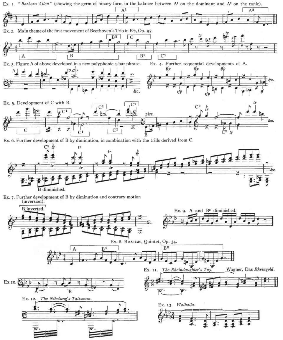 We subjoin some musical illustrations showing the treatment of figures in melody as a means of symmetry (Ex. 1), and development (Ex. 2–7), and (Ex. 8–13) some modern melodic transformations, differing from earlier methods in being immediate instead of gradual. (D. F. T.)