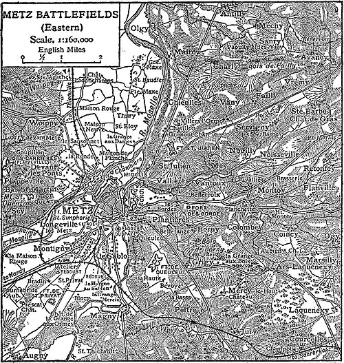 1. Colombey-Borny (August 14).—The French army under Marshal Bazaine was in and about Metz. The German I. and II. armies, on the march from the Saar, were heading for the Moselle between Metz and Pont-à-Mousson, and on the morning of the 14th of August the German I. Army (I., VII. and VIII. Corps, under General v. Steinmetz) lay on and east of the French, with outposts well to the front, watching the French camps east of Metz, which were little more than 1 m. to the front. Steinmetz had received from headquarters overnight instructions that on the 14th of August the I. Army would maintain the positions occupied during the 13th, and merely passed on these orders to his corps commanders. In Metz, meanwhile, Bazaine had decided to retreat, and during the morning orders to that effect reached his corps commanders, who commenced preparations for their execution. The 2nd Corps (Frossard) and 6th (Canrobert) began to retire about midday, the 3rd (Lebœuf), 4th (Ladmirault) and Imperial Guard (Bourbaki) were to follow. These preparations being observed, the German outposts got under arms. General von der Goltz, in command of the VII. Corps (7 battalions, 4 squadrons, 2 batteries) hearing from a passing officer that the I. Corps on his right was preparing to attack, and noting personally signs of retreat in the enemy’s lines, determined at 3 p.m. to advance his whole command to the ridge between Colombey and Borny (which was still occupied by French outposts), in order to clear up the situation. The ridge was captured with little resistance, but the sound of the firing at once set all the neighbouring troops in motion, and fortunately so, for the French had immediately retaliated on von der Goltz’s audacious attack. Between 4 and 6 p.m. there was continuous heavy fighting on the front from Borny to Méy, as both sides brought fresh troops into the field. The convex slopes falling from the Prussian position towards Metz gave plenty of cover to the French, and the setting sun shone full in the faces of the Prussian artillerymen. Thus the Prussian infantry encountered unusually obstinate resistance and the troops engaged rapidly slipped from all superior control. The above front was held by the French 3rd Corps. Shortly before 6.30 the 4th Corps (Ladmirault) suddenly began to deploy on the high ground to the north-west beyond Méy, thus threatening the right flank of the Prussian I. Corps (General v. Manteuffel). To meet this danger Manteuffel was compelled to direct his corps artillery and reserves, which were now rapidly coming up, away from the hard-pressed centre towards the oncoming infantry masses of Ladmirault. These, with the sun now almost at their backs, were shooting better than usual, and Manteuffel was compelled to call on the VIII. Corps for assistance, which its commander, under positive orders from Steinmetz, refused to give. Meanwhile Steinmetz had been sending peremptory orders to the battlefield to stop the battle, but neither of the corps commanders was able to enforce them. Fortunately for the Prussians, Bazaine had issued similar orders to his subordinates, who, having their men better in hand, were able to obey; and as night began to close in the French broke off the action and retired under the guns of the Metz forts, convinced that at last they had “broken the spell” of German success.