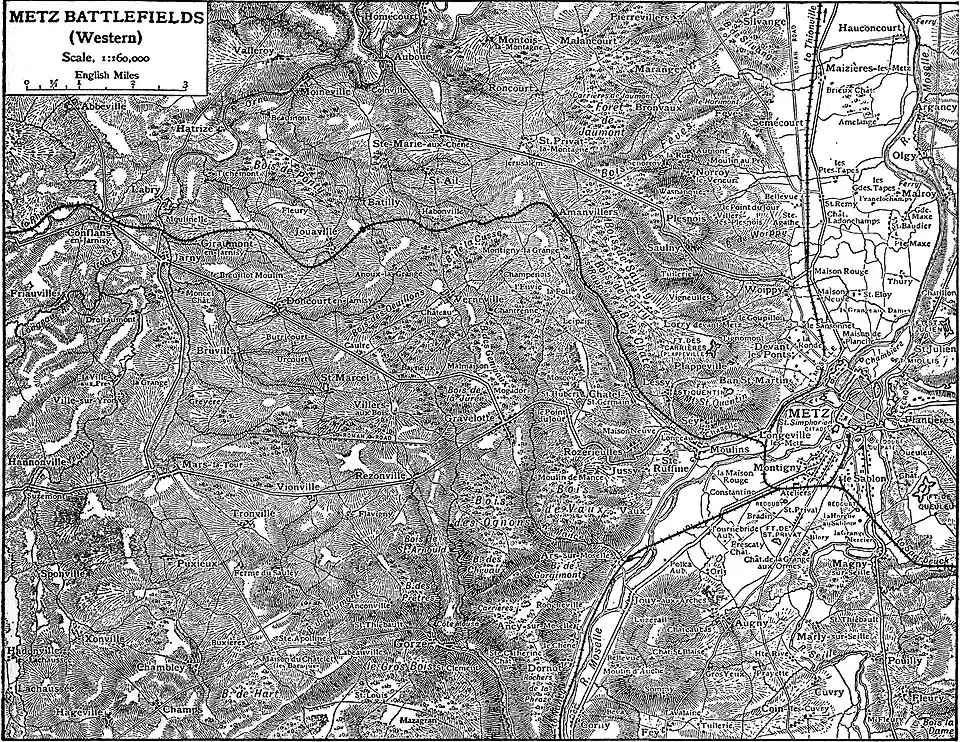 For the moment the chief care of the Prince was to guard against an attempt of the French army to break out to the westward. The I. Army Corps with Kummer’s Landwehr division (which arrived during the night of the 19th–20th of August) were to occupy a position to cover the rail head at Courcelles-Rémilly, and the remainder were disposed in the following order: The X. Corps was on the north, with a bridge head at Hauconcourt-sur-Moselle, the II., VIII. and VII. along the eastern slopes overlooking the Moselle valley, the latter having also a fortified bridge head at Ars-sur-Moselle, The III. and IX. were cantoned almost on the battlefield of the 18th, between Caulre Farm and Roncourt, ready to move off to the left and support the X. Corps in the event of an attempt on the part of the French to break out towards Thionville.