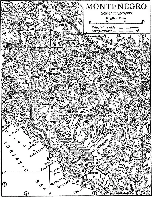 Shortly after the accession of Prince Nicholas (Aug. 13, 1860), an insurrection broke out in Herzegovina, and the sympathy which the mountaineers displayed with their Christian kinsmen led to a rupture with Turkey (1862). Notwithstanding the heroic defence of Ostrog by the prince’s father, Mirko, the war proved disastrous, Prince Nicholas. owing to the superior armament and discipline of the Turkish troops, and severe terms were imposed on the principality by the convention of Scutari (Aug. 31). During the fourteen years of peace which followed, the country suffered greatly from pestilence and famine. Within this period a series of reforms were carried out by the prince: the army was rearmed and reorganized, an educational system was initiated, and a constitution under which the prince surrendered various prerogatives to the Senate was granted. In 1869 the Krivoshians, or Serb inhabitants of the northern shores of the Bocche di Cattaro, rose against the Austrian government; the excitement in Montenegro was intense, but the prince succeeded in checking the warlike ardour of his subjects. The revolt in Bosnia and Herzegovina in 1875 had more important consequences for the principality. On the 2nd of July 1876 Prince Nicholas, in alliance with Prince Milan of Servia, declared war against Turkey and invaded Herzegovina. A victory was gained at Vuchidol (July 28), and Medun was captured; but the Servian army suffered reverses, and an armistice was arranged in November. In the following spring the determination of Russia to take the field against Turkey encouraged the Montenegrins to renew the war. The Turks succeeded in occupying Ostrog, but were subsequently repulsed; the greater part of their forces was soon withdrawn to Bulgaria, and Prince Nicholas captured successively Nikshitch, Antivari and Dulcigno. The recovery of the seaboard, which had belonged to Montenegro in the middle ages, was perhaps the principal achievement of the war. The enlargement of territory stipulated for by Russia under the treaty of San Stefano (March 3, 1878) would have brought Montenegro into close contiguity with Servia, thus facilitating the eventual union of the Serb race and closing the path of Austria towards the Aegean. The Berlin Treaty (article xxviii.) gave to Montenegro Nikshitch, Spuzh, Podgoritza, Plava, Gusinye and Antivari, but restored Dulcigno to Turkey. The resistance of the Moslem inhabitants of Plava and Gusinye to annexation led to long negotiations, and eventually the “Corti Compromise” was agreed to by a conference of the Powers at Constantinople (April 18, 1880). Plava and Gusinye were to be restored to Turkey, while the Montenegrin frontier was extended so as to include the Hoti and the greater part of the Klementi tribes. This arrangement, which could hardly have proved successful, was not carried out by Turkey, and the Powers subsequently decided to annex Dulcigno to Montenegro in exchange for Plava and Gusinye. The Porte interposed delays, though consenting in principle, and the Albanian League (see Albania) assumed a menacing attitude. On the 28th of September the fleets of the Powers under Admiral Seymour appeared off Dulcigno, and the British government shortly afterwards proposed to occupy Smyrna. On the 11th of November the Porte yielded; on the 22nd the Turkish troops defeated the Albanians, and on the 25th Montenegro obtained possession of Dulcigno. The present frontier, as already described, was shortly afterwards delimited by an international commission. With the exception of some frontier troubles, the years since 1880 have been spent in peace, and the country has advanced in prosperity under the autocratic but enlightened rule of Prince Nicholas. The relations with Turkey, the traditional foe, have improved, While those with Austria have become less friendly. In July 1893 the four-hundredth anniversary of the foundation of the printing-press at Obod was celebrated at Cettigne, several foreign universities and learned bodies being represented at the festivities. In September 1896 the bi-centenary of the Petrovitch dynasty was commemorated. The marriage in the same year of Princess Helen, fourth daughter of Prince Nicholas, with the crown prince of Italy, subsequently King Victor Emmanuel III., led to an increase of Italian influence in the principality. In December 1900 Prince Nicholas assumed the title “Royal Highness.” In October 1906 the first Montenegrin parliament assembled at Cettigne; and on the 28th of August 1910, Prince Nicholas (q.v.) assumed the title of king.