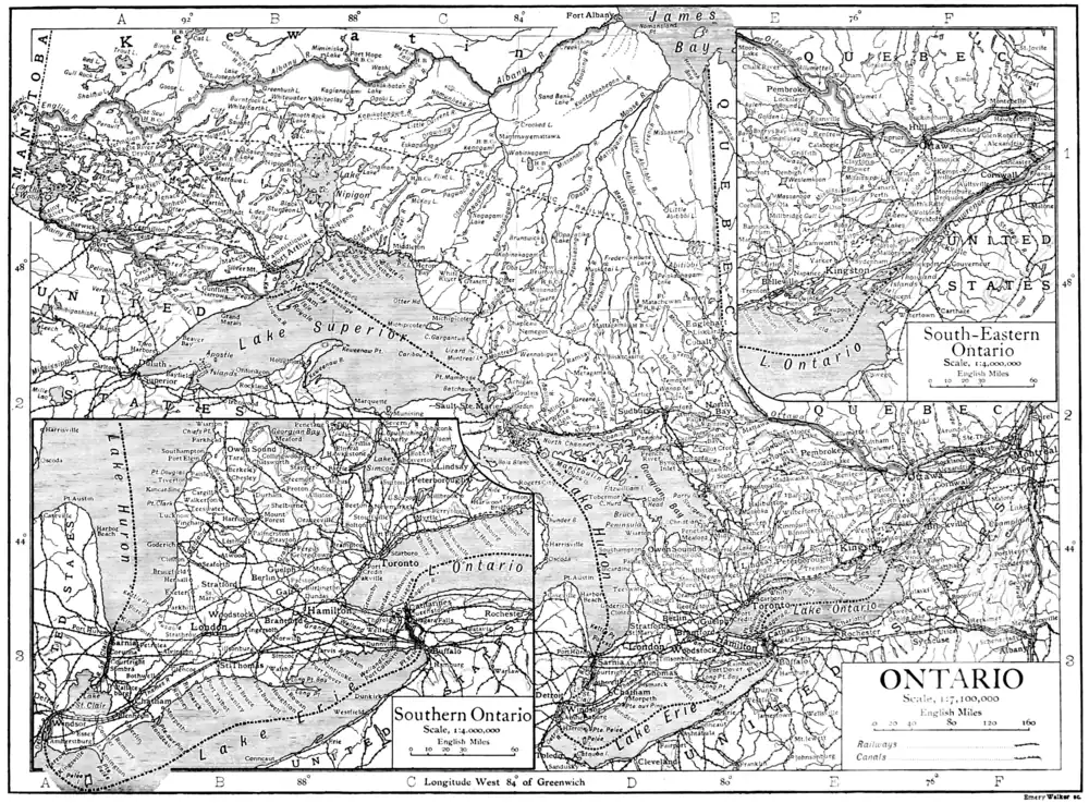 ONTARIO, a province of Canada, having the province of Quebec to the E., the states of New York, Ohio, Michigan, Wisconsin, and Minnesota to the S., Manitoba to the W., and the district of Keewatin with James Bay to the N. In most cases the actual boundary consists of rivers or lakes, the Ottawa to the north-east, the St Lawrence and its chain of lakes and rivers to the south as far as Pigeon river, which separates Ontario from Minnesota. From this a canoe route over small rivers and lakes leads to the Lake-of-the-Woods, which lies between Ontario, Minnesota and Manitoba; and English and Albany rivers with various lakes carry the boundary to James Bay. From Lake Temiscaming northwards the boundary is the meridian of 79° 30′.