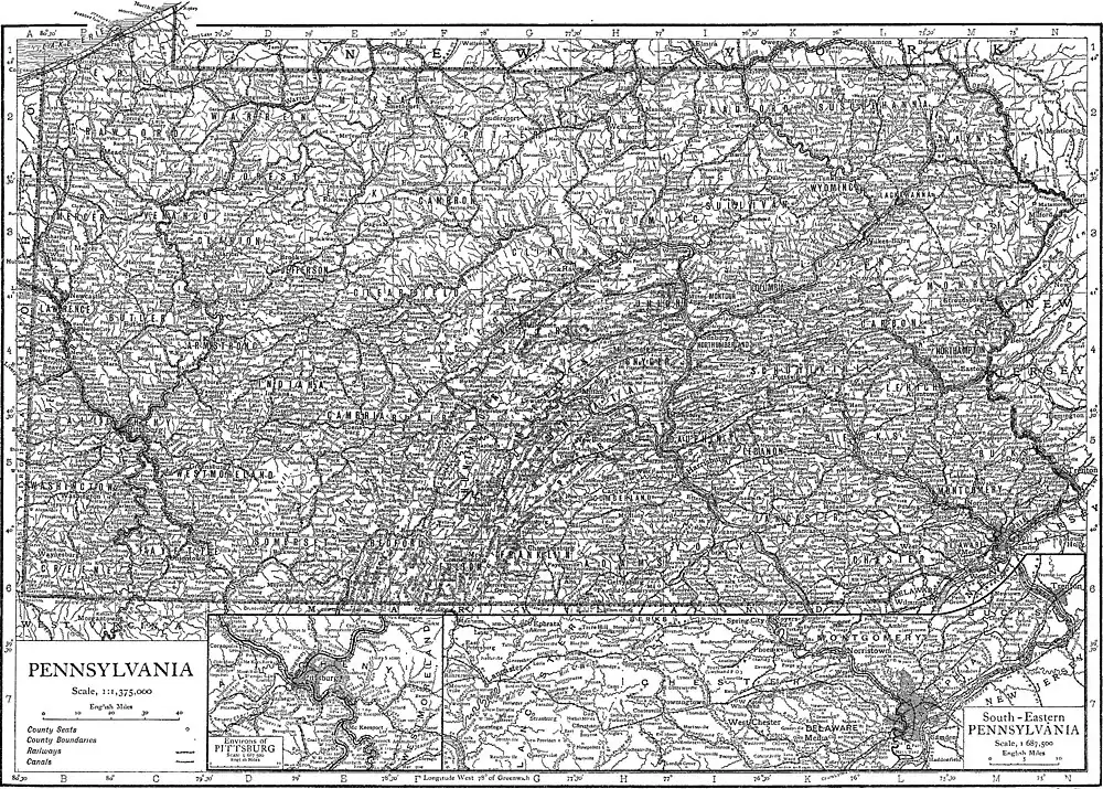 Physical Features.—Pennsylvania skirts the coastal plain in the south-east below Philadelphia, is traversed from north-east to south-west by the three divisions of the Appalachian province—Piedmont or older Appalachian belt, younger Appalachian ridges and valleys and Alleghany plateau—and in the north-west corner is a small part of the Erie plain. The entire surface has a mean elevation of about 1100 ft. above the sea. It rises from 20 ft. or less on the bank of the Delaware between Philadelphia and Chester to 2000–3000 ft. on the higher ridges in the middle section (3136 ft. on Blue Knob in Bedford county), and falls again to 900–1000 ft. on the Ohio border and to 750 ft. or less on the Erie plain; in the south-east is an area of about 6100 sq. m. that is less than 500 ft. above the sea, while on the ridges in the middle of the state is an aggregate area of about 2000 sq. m. that everywhere exceeds 2000 ft. in elevation. The area below 500 ft. is mostly in the Triassic lowland of the Piedmont region, or, as the Pennsylvania portion of it is called, the south-east province. This is an undulating plain which has been produced by the wearing away of weak sandstones, &c. On the north and west borders of this plain are two parts of a chain of semi-detached and usually rounded hills, known as the South Mountains. The north-east part is a south-westward arm of the New England uplands, is known as the Reading Prong, and extends from New Jersey through Easton to Reading. The south-west part is a north-eastern prolongation of the Virginia Piedmont, is known as the Cumberland Prong, and extends N.N.E. through the south part of Cumberland county. In the Reading Prong most of the hills rise 900–1000 ft. above the sea and about one-half that height above the surrounding country; in the Cumberland Prong their height increases to the southward until, on the Maryland border, they rise 2100 ft. above the sea and 1400 ft. above the adjoining plain. Another range of hills, known as the Trenton Prong, extends from the northern suburbs of Philadelphia both westward and southward through Chester, Delaware, Lancaster and York counties, but these rise only 400–600 ft. above the sea and have few steep slopes. Both of these ranges of hills are composed of hard crystalline rocks, and between them lies the lowland eroded on the weaker sandstones and sediments. In Bucks and Montgomery counties is a large sandstone area; traversing Chester county is the narrow Chester Valley with a limestone bottom, and in Lancaster county is the most extensive limestone plain. The Pennsylvania portion of the younger Appalachian ridges and valleys, known as the central province of the state, embraces the region between the South Mountains, on the south-east, and the crest of the Alleghany plateau or Alleghany Front, on the north-west. It extends from south-west to north-east about 230 m. and has a nearly uniform width of 50 m. except that it narrows rapidly as it approaches the north-east corner of the state. The ridges and intervening valleys, long parts of which have an approximately parallel trend from south-west to north-east, were formed by the erosion of folded sediments of varying hardness, the weak belts of rock being etched out to form valleys and the hard belts remaining as mountain ridges. After the folding the whole region was worn down nearly to sea-level, forming a low plain which bevelled across the geological structure of the entire state, including the Piedmont area to the south-east and the plateau area to the north-west. Then came a broad uplift followed by the erosion which carved out the valleys, leaving hard rocks as mountain ridges which rise about to the level of the old erosion plain. In Bedford county and elsewhere the ridges rise to 2400 ft. or more above the sea, but their more usual height is 1400 to 2000 ft. above the sea and 500 to 1000 ft. above the intervening valleys. Their crest lines are often of nearly uniform height for miles and generally are little broken except by an occasional V-shaped wind gap, a narrow water gap or a rounded knob. The valleys rarely exceed more than a few miles in width, are usually steep-sided, and frequently are traversed by longitudinal ranges of hills and cross ridges; but the Pennsylvania portion of the Appalachian or Great Valley, which forms a distinct division of the central province and lies between the South Mountains and the long rampart of Blue Mountain, is about 10 m. in width on the Maryland border and to the north-east its width increases to 20 m. The north-west part of it is a slate belt that has been much dissected by eroding streams, but the south-east part is a gently rolling belt of limestone to which occasionally a steep hill descends from the slate belt. The Pocono plateau, into which the central province merges at its north-east extremity, is a continuation of the Catskill plateau southward from New York and covers Wayne, Pike and Monroe counties and the east portion of Carbon county. Its surface is underlaid by a hard sandstone and conglomerate which erode slowly, and the general upland level, which is 1400–1800 ft. above the sea, is little broken except by shallow valleys and occasional knobs. The Alleghany plateau, which extends from the crest of the Alleghany Front to and beyond the west and north borders of Pennsylvania and covers more than one-half of the state, is much more dissected. In Tioga and Potter counties on the north middle border, it rises 2400–2500 ft. above the sea, but from this height the general upland level falls gradually to 1200–1300 ft. in the south-west and 900–1000 ft. along the Ohio border, and in Erie county there is a sudden fall of about 200 ft. to the Erie plain. In the northern, middle and south-west portions of this plateau province the upland is cut by an intricate network of narrow valleys and ravines that are commonly 300–600 ft. deep and occasionally 800–1000 ft. deep, but west of the Al