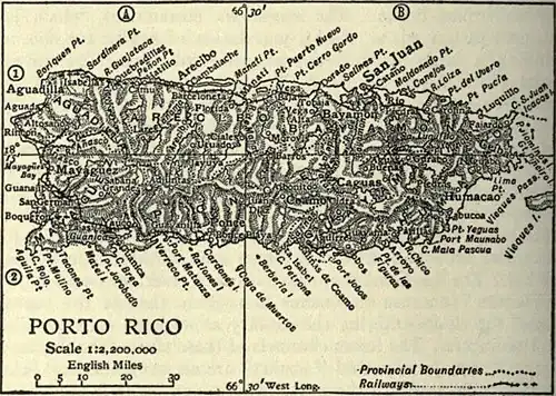 Bibliography.—The main source for the history under the Spanish is Fray Inigo Abbad, Historia geografica civil y natural de San Juan Bautista de Puerto Rico (Madrid, 1788; a new edition with notes by Jose J. Acosta was published in Porto Rico in 1866). Abbad makes extensive quotations from early historians of Spanish America. The best modern critical account in Spanish is Salvador Brau, Puerto Rico y su historia (Valencia, 1894). Probably the best account in English, although one leaving much to be desired, is R. A. Van Middeldyk, The History of Puerto Rico (New York, 1903). R. H. Davis, The Cuban and Porto Rican Campaigns (New York, 1898), is a sketch of the invasion of the island in 1898. L. S. Rowe, The United States and Porto Rico (ibid., 1900) treats clearly and briefly of the problems arising from American control, and a like characterization may be made of W. F. Willoughby, Territories and Dependencies of the United States (New York, 1905). Van Middeldyk gives a brief bibliography of historical works, and a more extensive list is given in General George W. Davis’s Report on the Military Government of Porto Rico. See also Annual Reports of the Governor of Porto Rico (Washington, 1901 sqq.); H. M. Wilson, “Porto Rico: Its Topography and Aspects,” in the Bulletin Amer. Geogr. Soc. New York, vol. xxxii. (New York, 1900); W. A. Alexander, “Porto Rico: Its Climate and Resources,” in the same, vol. xxxiv. (ibid., 1902); Report on the Census of Porto Rico (Washington, 1900); W. F. Willoughby, Insular and Municipal Finances in Porto Rico for the Fiscal Year 1902–1903, issued by the Bureau of the United States Census (ibid., 1905); R. T. Hill, Cuba and Porto Rico (New York, 1898).