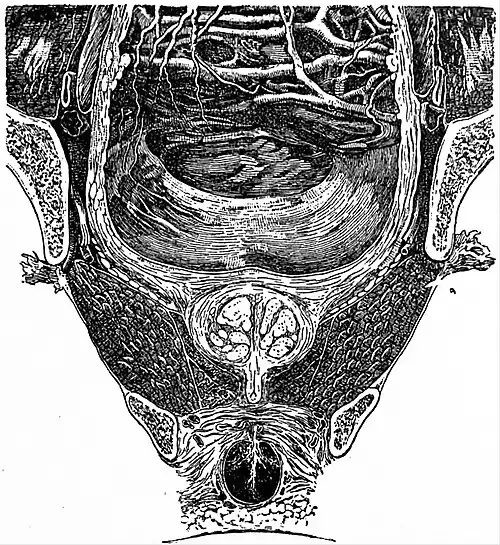 The prostate is partly a muscular and partly a glandular structure, situated just below the bladder and traversed by the urethra; it is of a somewhat conical form with the base upward in contact with the bladder. Both vertically and transversely it measures about an inch and a quarter, while antero-posteriorly it is only about three-quarters of an inch, though its size is liable to great variation. It is enclosed in a fibrous capsule from which it is separated by the prostatic plexus of veins anteriorly. It is often described as formed of three lobes two lateral and a median or posterior, but careful sections and recent research throw doubt on the existence of the last.