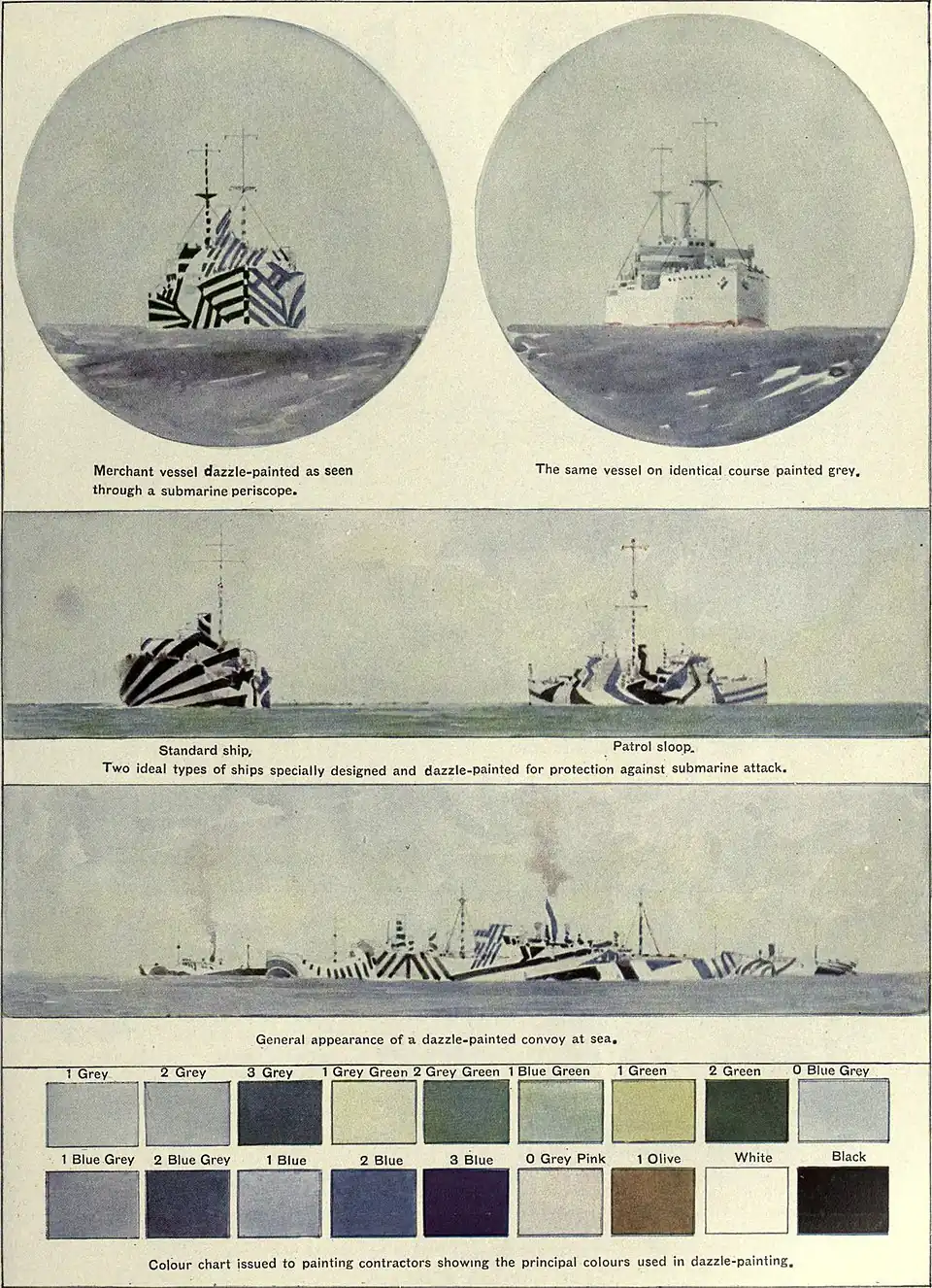 It was not until 1917, during the height of the submarine peril, that a practical scheme having a definite end in view and formulated on scientific lines was put forward and officially adopted by the British authorities. This scheme embodied entirely new ideas on sea camouflage, and was rescued from the early disease which had attended all its predecessors by the fact that the proposer was able to supply designs to scale in large numbers, all bearing out a central idea. It was called for distinction's sake in official documents “Dazzle Painting.” The sole object of dazzle painting was so to distort the normal appearance of a vessel that her actual course became a matter of doubt in the mind of a submarine officer, the estimation of a vessel's true course being the prime factor required to ensure successful attack.