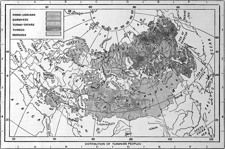 Having spread in prehistoric times from the Altai mountains in the centre of Asia, this ethnic family at the present day occupies a broad belt of territory extending from Thrace across Asia to the sea of Japan and reaching from about 35° N. lat. to the coast of the Arctic Ocean. It consists of five main branches, the Samoyeds, the Finno-Ugrians and the Tunguses constituting the northern, and the Mongols and the Turks the southern division. The countries inhabited by the Turanians are Siberia, Mongolia, Manchuria, Chinese and Russian Turkestan, Asia Minor, parts of Persia and Afghanistan, the Caucasus, the Crimea, the Volga and Pechora regions of eastern Russia, Lapland, Finland, Hungary, and portions of the Balkans.