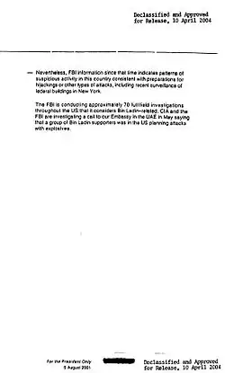 Nevertheless, FBI information since that time indicates patterns of suspicious activity in this country consistent with preparations for hijackings or other types of attacks, including recent surveillance of federal buildings in New York.