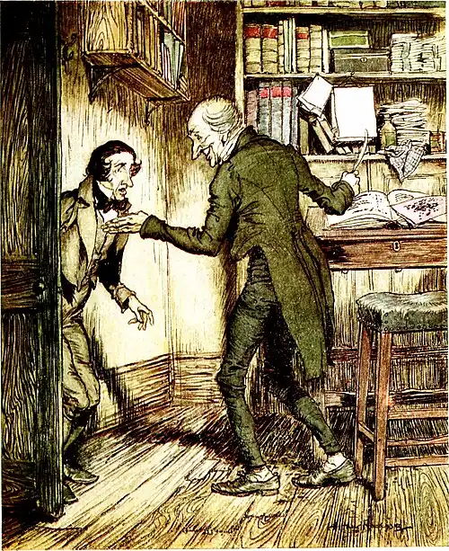 Bob trembled, and got a little nearer to the ruler. He had a momentary idea of knocking Scrooge down with it, holding him, and calling to the people in the court for help and a strait-waistcoat.