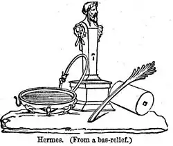 The existing remains of ancient art are rich in terminal statues of all the classes which have been described; and specimens of nearly all may be seen in the British Museum, and in engravings in Müller's Denkmäler der alten Kunst (vol. i. pl. i. Nos. 3, 4, 5;–vol. ii. pl. xxxi. No. 341; pl. xxxiii. Nos. 376, 386, 387; pl. xxxvi. Nos. 428, 429; pl. xlii. No. 526). The first two examples in Müller are very interesting: the one is a bas-relief, exhibiting a Hermes decorated with garlands and surrounded with the implements of his worship, as shown in the following engraving; the other is also a bas-relief in which we see a terminal bust of Dionysus washed and decorated by a man and three women. Hermae of the bearded Dionysus occur frequently among existing remains (Gurlitt, Archäol. Schr. p. 194 ff.) Respecting the Hermae on coins, see Rasche, Lex. Univ. Rei Num. s. vv. Herma, Hermathene, Hermes. (C. O. Müller, Archäol. der Kunst; Müller and Osterley, Denkmäler der alten Kunst; Baumeister, Denkmäler, s. vv. Götterbilder, Hermes.) [P.S] [W.W]