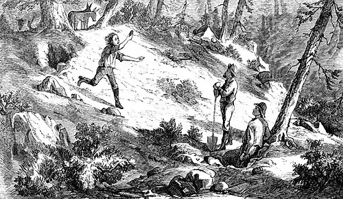 Such pockets are good things to have. The company in the gulch, in which the owner of the mule was a large stockholder, after some bargaining bought the claim for $10,000, paid him down in gold-dust and orders on their partners, and hurried him off for Placerville early next morning, lest he should repent of his bargain and want to back out. Next morning they were at work there bright and early, while he was collecting his money in Placerville, and getting ready to "go down to the Bay"—i. e., to visit San Francisco. This was on Wednesday. The mule was delivered to his delighted owner, and, in consideration of his good services, enjoyed tall feed in a livery-stable for the rest of the week. His proprietor, anxious to inspect his new source-of untold wealth, hired a horse and started at once for the gulch.