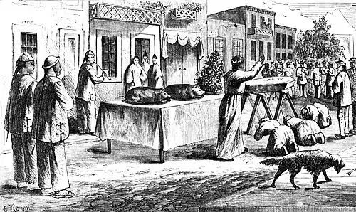Celestials were betting themselves poor at the game of "Tan," or in the restaurants where others were dining convivially. It was a glorious moonlight night, such as one rarely sees, save on the Pacific coast, or in the tropics. The whole air was loaded with the fumes of burning "joss sticks," or incense candles, made from powdered sandal wood, fragrant gums, etc., the blue smoke of which rose from every doorway, open window, crack, crevice, or cranny in the houses where the blue-bloused sons of China congregate, resting on the Chinese quarter like a fog on a Jersey salt-marsh, or a cloud of mosquitoes on a Mississippi river-bottom. While we were standing there, a party of Chinese boys placed a row of these little joss-sticks upright along the edge of the gutter by the sidewalk, leading-down to the centre of the block northwards, and set them all burning-at once. As the cloud of fragrant smoke rose up from them, a well-dressed Chinaman appeared and directed a servant where to place a large tray, or salver, on which was neatly arranged a hot lunch, prepared in the most attractive style of the first-class Chinese culinary artist. The lunch being duly arranged on the edge of the side-walk, he kneeled before it, chin-chinned repeatedly until his forehead nearly touched the curbstone, and then, to avoid the curious and irreverent throng of Caucasians, who were fast gathering about him, arose and hustled away the lunch into the house from which he came. A huge mass of curiously curled, and twisted, and convoluted, and cornuted—and I don't know what not else—tissue paper, forming some emblematic figures, which resembled in shape, and color, and design nothing which Caucasian mind ever conceived, or could comprehend if described—and I don't know how to describe it—was lying in the street in front of the line of joss-sticks, and, as he arose to go, a boy touched off a pile of fire-crackers concealed within it, and in an instant it disappeared in a blaze of glory. This appeared to be a part of the programme.