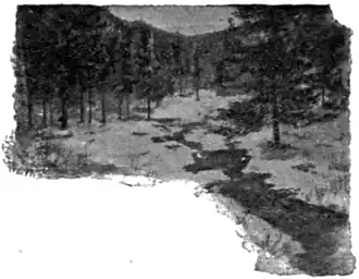 We had been walking our horses for some time through the snow which was deep in the shade of the evergreens. The entrance to the cañon was not so marked as to be fixed at any one point, but at Miss Lamb's word a sort of hush seemed to descend upon us, much as though we had entered one of those solemn old cathedrals in South Germany. The road was narrow, so that we soon went single file. Miss Lamb led the way, her horse making the first marks in the unbroken snow. Not strictly the first marks, however, for soon our guide turned and pointed out to us the tiny footprints of little creatures who had crossed the open space in search of water from the icethatched brook. Some of them we thought must have been coyotes, the tracks being as large as a child's shoe. But oftener the little marks suggested rabbits and squirrels, timid, furry bits of wild life, the thought of whose bright eyes and quick, sensitive motions seemed to animate the lonely scene. Once in a while we came to a bridge over the frozen brook, whose course the road followed. In the shadow of the gigantic gray and red walls on whose perpendicular heights there was no chance for the snow to cling, the network of leafless bushes, bending over the brook, was glittering with ice, while the branches of the blue-green firtrees, drooped beneath their feathery burden. The way those walls towered up above it all was astonishing, with the sky like a blue roof spanning the interval.