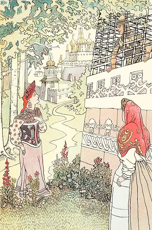 When King Guidon returned home, he sent his servant Litscharda as ambassador to King Kirbit Versoulovich, the father of the Princess Militrisa Kirbitovna, with a letter written by his own hand, to ask for his daughter in marriage. When Litscharda arrived at the city of Dimichtian, he delivered to King Kirbit the letter from his master; and after Kirbit had read it through, he went at once to the Princess Militrisa, and said to her: "My dear daughter, the fame of your beauty has reached the brave and powerful King Guidon. He has been in the city to see you, and has fallen deeply in love with you. He has sent a messenger to demand your hand, and I have already given my consent."