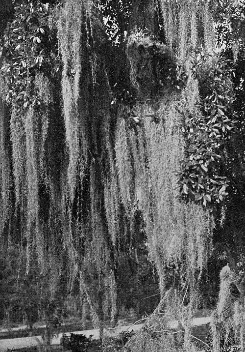 Toward evening I came to the country of one of the most striking of southern plants, the so-called "Long Moss" or Spanish Moss [Tillandsia], though it is a flowering plant and belongs to the same family as the pineapple [Bromelworts]. The trees hereabouts have all their branches draped with it, producing a remarkable effect.