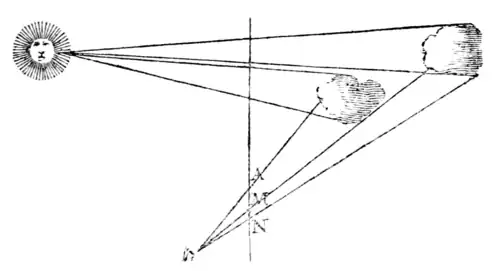 Of two objects at equal height, that which is the farthest off will appear the lowest. Observe the first cloud in the cut, though it is lower than the second, it appears as if it were higher. This is demonstrated by the section of the pyramidical rays of the low cloud at M A, and the second (which is higher) at