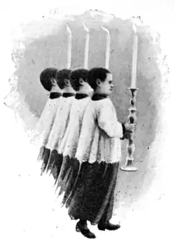 Presently the procession drew near, and crossed the bridge, banners waving, candles flaming, priests intoning. The band struck up, and the voices of the priests were drowned in the songs of the choristers.