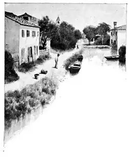 She found the two gondolas moored a few rods down the rio, lying close to the shore in the shadow of the alder bushes that leaned sociably over the bank. Pietro was lying flat on the floor of his boat, fast asleep; Nanni, whose gondola was the first she came to, was sitting in the bow with a book in his hand, which he slipped into his pocket at the approach of the Signorina. His hat was lying on the floor, and the flickering shadows of the leaves on his face and figure made a peaceful impression of summer and happy ease.