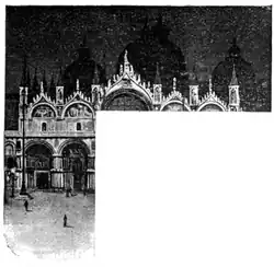 He had suddenly turned and looked up at the front of San Marco, gleaming in the brilliant illumination, like a shrine studded with precious stones. In the concentrated light of hundreds of gas-jets, each exquisite detail, each shining gold mosaic and lavish carving stood out with marvellous distinctness. The golden-winged angels that mount a mystic stairway above the great central arch, the bronze horses prancing so harmlessly over the main portal, even the quaint bas-relief of St. George, sitting, with such unimpeachable dignity, upon his camp-stool,—each and all were far more clearly enunciated than ever they are in the impartial splendor of daylight. Against the darkly luminous, unfathomable sky, the outline of the domes showed clear-cut and harmonious, and over yonder, above the great Palazzo, whose columns, for that evening at least, were surely carved in ivory and wrought with lace, a remote, half-grown moon looked wonderingly down.