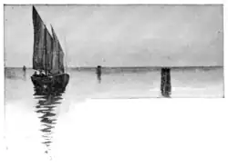 Over the line of the jetty was the deep blue Adriatic, sweeping to the horizon, its nearer reaches dotted with brilliant sails, shining in every shade of red and yellow and ruddy brown. The long, outer shore of the Lido, stretching far away to the tower of Malamocco, was edged with white, as the gentle curve of the waves broke with a toss of spray upon the sand.