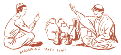 judgments. To bargain intelligently is to show understanding in values. They may treble the price they expect you to pay. If you pay it, they know you don't know the real values. But bargain politely. Most of these tradesmen know each other well and treat one another as host and guest. Friendships result from trade. In the larger "westernized" shops, there is usually a fixed price. So, you won't have to haggle with them.
