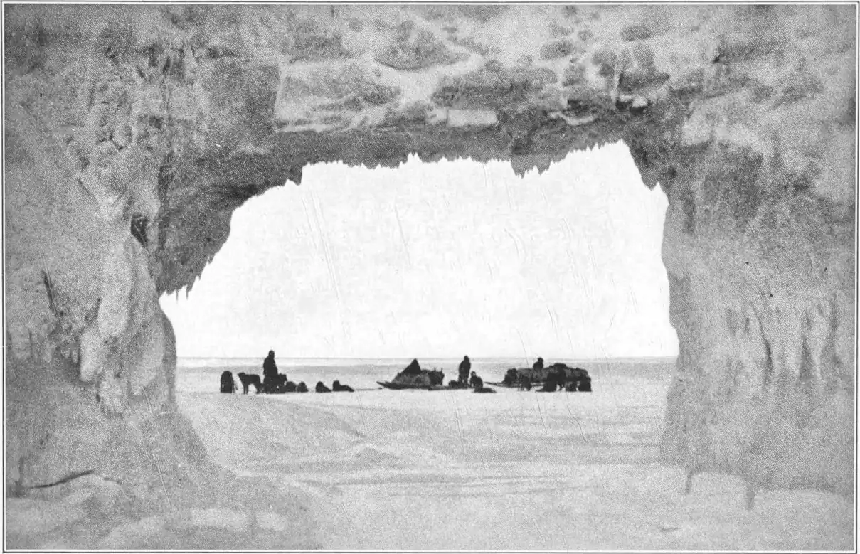 The coast we had now to follow to the northward was for the most part dull and monotonous; it was low-lying country, in many places merging imperceptibly into the tumbled ice and pressure ridges off the shore, and only broken here and there by steep sandstone rocks often hollowed into fantastic caves that afforded a welcome shelter. The ice off shore was good, and when we wanted fresh provisions we had. as a rule only to drive out some ten kilometres where seal could be had without difficulty in the patches of open water. We were loth to waste time on such excursions however, and only turned aside when forced to it. At one place we encountered a solitary Swede, Kalle Lewin, of Kalmar, who quoted Frithiof's Saga with true patriotic enthusiasm, in the intervals of gloomy prophesyings as to the prospects of fox in the coming season. A day's journey farther north, at Pierce Point, in the most beautiful part of the country, amid arches and monuments of ice-embroidered sandstone, we met another trapper named Bezona, said to be an Italian nobleman who had come to the Arctic in search of an Eldorado—up to date without success.