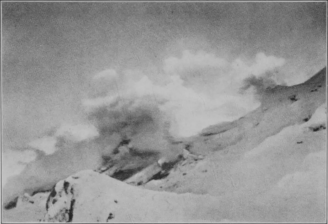 Next day we encountered a natural phenomenon, and camped for a spell to take some pictures, though we could only stay a few hours. We had reached the Smoking Mountains. Long ago, perhaps a hundred years or more, some subterranean deposit of coal here caught fire, and the smoke is still pouring out from ten different hills. In the strong sunlight, they seem wrapped in halos of greyish blue smoke, that oozes out from every crack and crevice in the sides. Here and there among the hollows, white