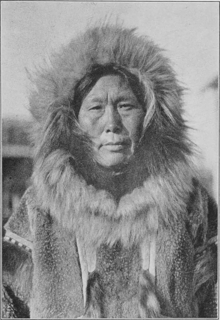 I had not expected to find anything of interest on this part of my journey, and really considered my collections at an end on leaving Canada; I soon found, however, that this was not the case. Men and women here were less sophisticated than those of the Mackenzie Delta, and there was a store of folklore and mythology ready to hand. I decided therefore to take advantage of the opportunity, and make some stay here, despite the advice of experts who declared that if I did not push on at once, I should have to wait until August and go on by sea. We were just at the most exciting part of the annual whaling season. Only a few kilometres out from land was the open sea, rocking the loose icefloes; the sea birds had gathered in dense flocks, and their cries could be heard right up over the land. Nearly all the men lived out at the edge of the ice in rough hunting camps; only the women and children were at home. All were excited, and no one ever seemed to go to sleep. When we ourselves went to rest, at four in the morning, and opened the windows, we heard on all sides the chatter of women, the cries of children and the howling of dogs. But on all the highest points of the clay cliffs were watchful outposts, waiting for the moment when they could with a deafening shout, announce to these careless night-birds that a whale had been harpooned.