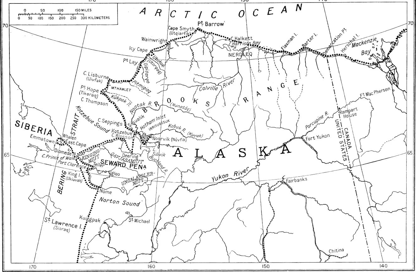 Alaska was discovered in 1741 by the Danish explorer Vitus Bering, then in the service of Russia and voyaging up through the Strait which bears his name. Little more was known of it however, for many years after. In 1826, an English expedition under Beechy visited Point Barrow and opened the way for others. The Eskimos who lived between Norton Sound and the Arctic Ocean appear to have been a warlike people, their young men being regularly trained for war, hardening themselves by all manner of athletic exercises, dieting themselves, and often obliged to fast in order to habituate themselves to great hardships, or making journeys on foot for many days in succession as a test of endurance. Not only were the different tribes constantly at feud among themselves; they did not hesitate to enter upon combats with Indians or white