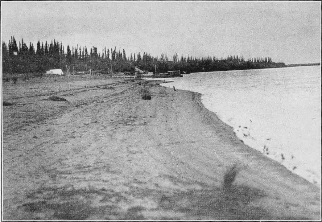 In the course of the morning, we reached the Kuvak Delta, a big plain cut through by numerous channels, forming a maze which it would be impossible to negotiate with safety were it not for the marks set up at intervals along the fairway. The landscape seems altogether tropical to us, after the desolation of the Arctic coast. Bushes, low trees and tall grass run right out into the water, and ducks, geese and other waterfowl rise noisily as we near them. At noon we land at a little "road house" or travellers' shelter, open to any who happen to pass. It is designed more especially for winter use, and comprises, in addition to the house itself, a kennel with room for 15 dogs, a store of hay and a stack of firewood. We got a fire going in the stove, and had a meal ready in a twinkling. This disposed of, we went off up river once more. The vegetation grows richer and taller as we advance, and a couple of hours after leaving the road house we have fir trees on either side. Only a few at first, looking like forgotten Christmas trees, solitary strangers among the native birch and willow, but they soon