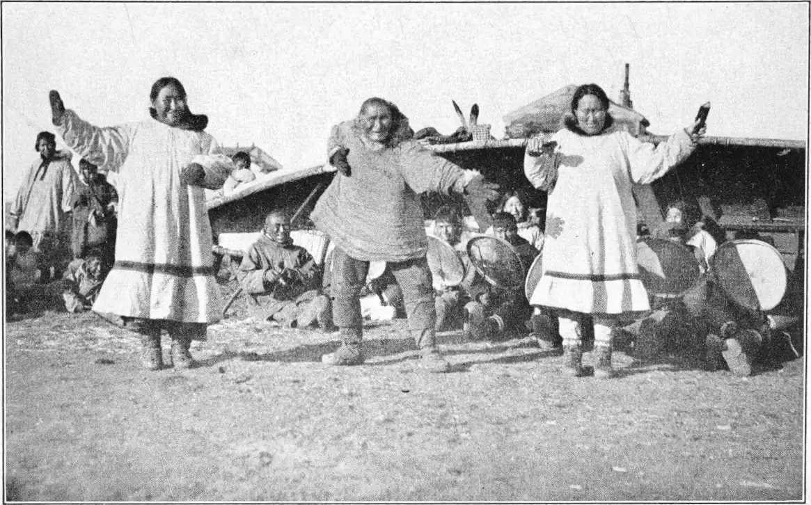 The feast itself lasts eight days. During the past year, the bladders of all ribbon seals caught have been carefully preserved, and these are now brought in to the dance house, hung up with bundles of herbs under the roof, where a harpoon and line are also fixed, with a small lamp lighted beneath them. Then with great solemnity the new clothes are put on, and the new utensils handed round to their respective owners. The women are called in, and feasts are held every day, ending with song and dance. At last, the seals' bladders are dropped into the sea through a hole in the ice, while the angakoqs implore the animals to be generous to men. On the eighth evening, men and women exchange gifts, and promise to try their best in the coming winter to be better in conduct and in their respective tasks.