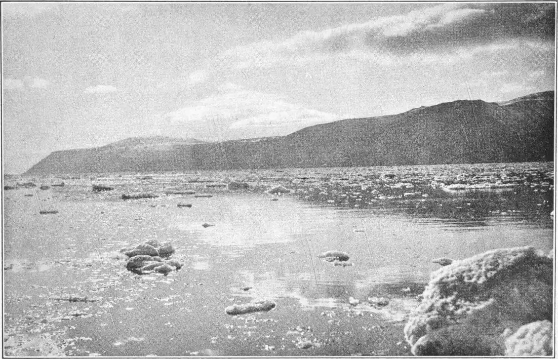 We hoisted sail and got under way. The ice lay close in to shore, and we were forced to lie for a little while off the Eskimo village at East Cape. It was