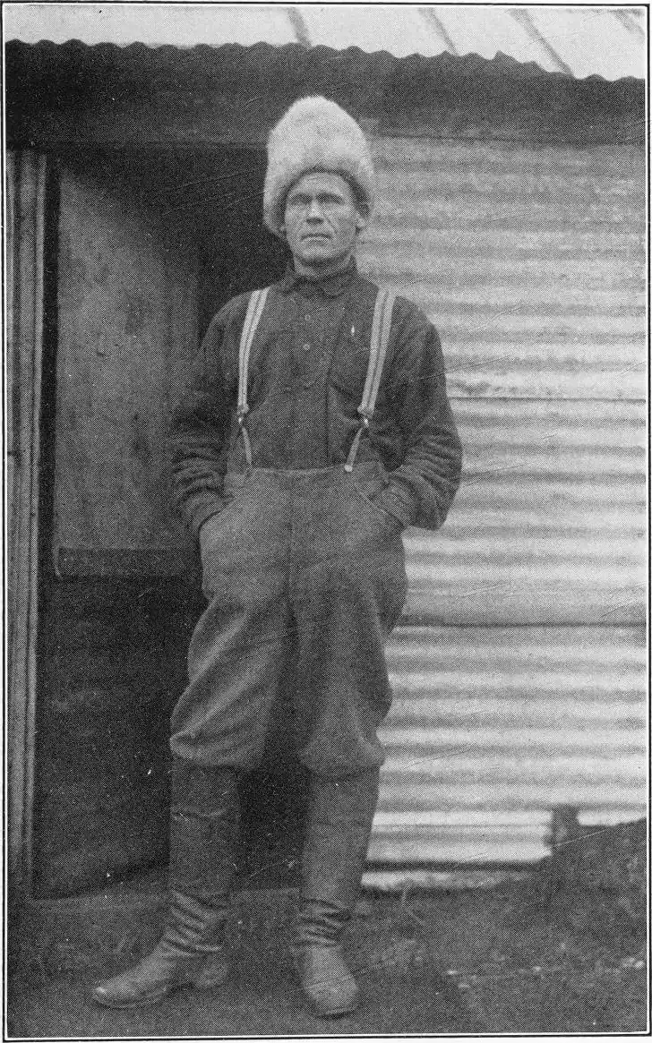 In front of the yarrangs stood women in their curious combination garments of reindeer skin, worn as a rule with one arm out of the sleeve, leaving half the body naked. They were not without a certain simple grace, rather reserved, and trying not to appear inquisitive. I had not time to study them closely, however; an elderly man, broad-shouldered and of stern countenance, stepped forward and I braced myself to meet the Governor. As it turned out, however, this was only a bankrupt trader-one of the victims of the new monopoly. A moment later another Russian appeared, dressed from head to foot in sealskin; he introduced himself in excellent English as Peter Cossigan, trader and interpreter.