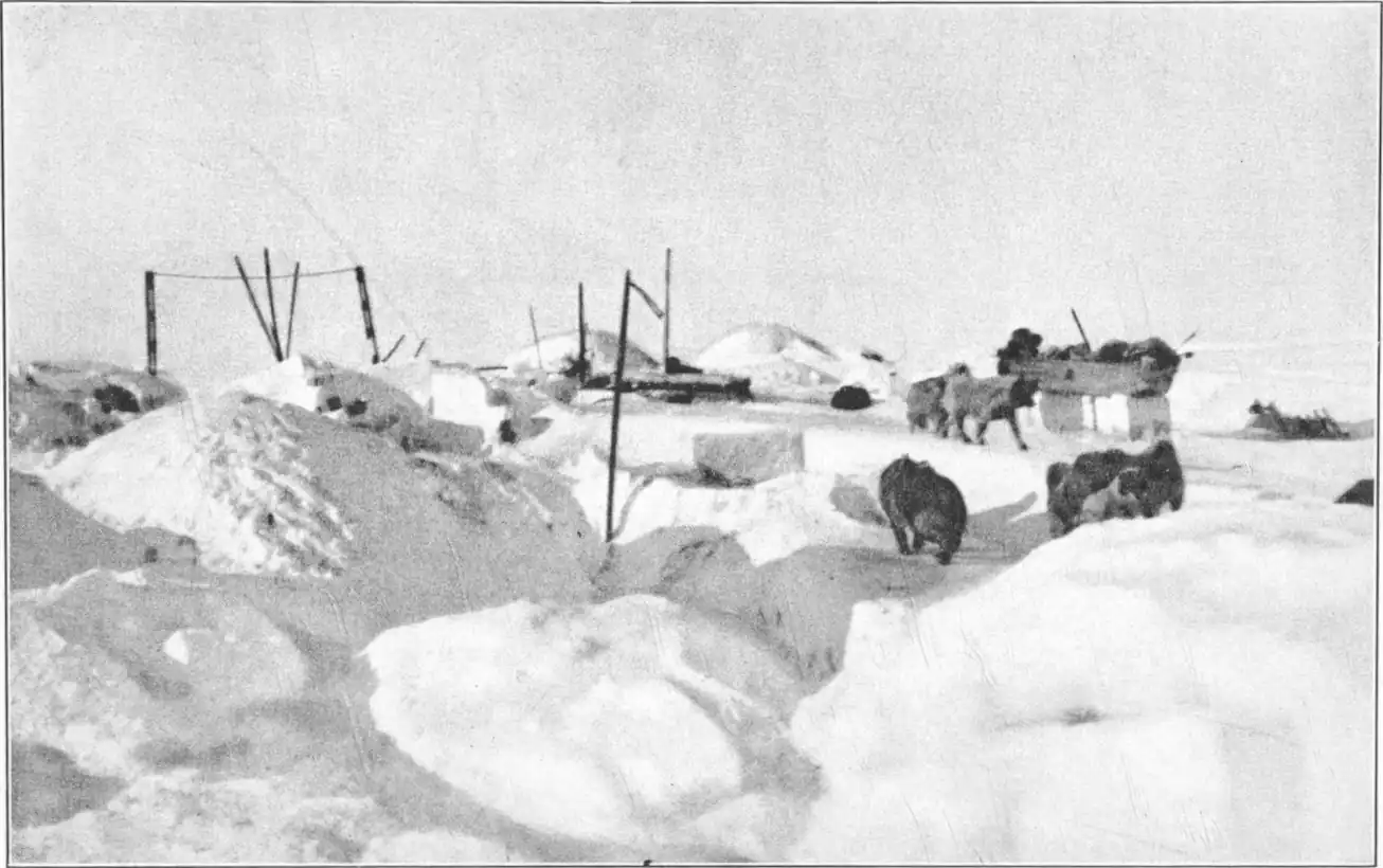 We explained that we had come down to hunt walrus, and the news was greeted with acclamation by our host and his party. They had been thinking of doing the same themselves, and it was now suggested that the whole village should move down to some snowdrifts on the lowlying land at Cape Elizabeth. They had been hunting inland all the summer, and there were numerous good meat depots established in the neighborhood. There was oil enough to warm up the houses for a while, but the last bag of blubber had already been opened. We decided therefore to go hunting on the ice. It was necessary first of all, however, to spend one day in fetching in stores of caribou meat from the depots, as there was no saying how long it might be before we procured any other.