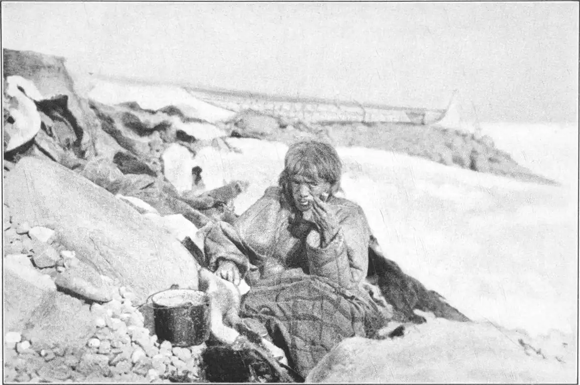 The only serious difficulty they have to contend with is that they have no means of getting their footwear dried after a long day's hunting. If they have skins enough, the wet things are thrown away and replaced by new ones; failing this, the old wet things have to be dried at night by laying them next to the body.