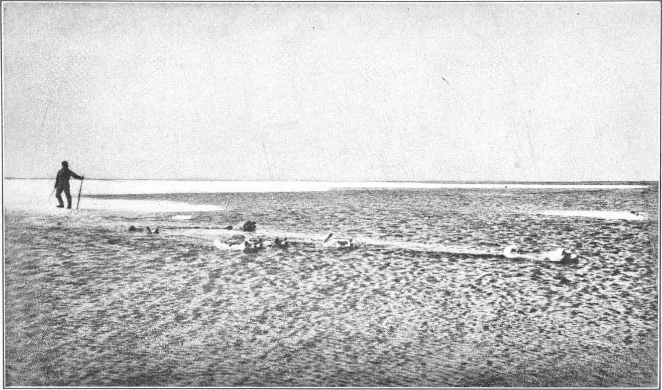 It was slow going over the swampy tundra, that squelched underfoot at every step. By six the next morning we reached a group of three tents, and were surprised to find the inmates here also on the verge of starvation. We had the better part of two caribou carcases with us, and seeing no reason to carry a heavier load than needed, we invited the village to a feast. The fine fresh meat was disposed of with remarkable celerity, and I had once more an opportunity of witnessing the feats of which an Eskimo is capable in this direction. Hunger however, had by no means impaired the spirits of these