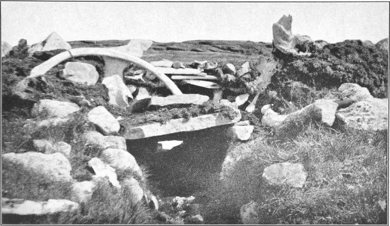 The houses themselves had fallen to pieces long since, and the remains were scattered, weatherworn and overgrown with grass and moss to such an extent that our excavations gave but a poor idea of their original appearance. The implements and objects found among the ruins, however, gave an excellent view of the culture of the period from which they were derived. The materials comprised bone, walrus tusk and caribou antler, flint, slate and soapstone, whalebone, some wood, and occasionally metal, this last in the form of cold hammered copper (probably obtained by barter from the Eskimos of the west), with a single fragment of meteoric iron forming the point of a harpoon.